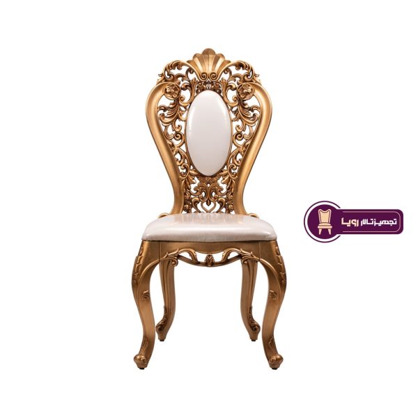 ما در تیم تجهیزات تالار رویا بدنهی صندلیهای تالاری مدل صنم را در رنگ طلایی (گلد) در خدمت مشتریان محترم قرار دادهایم. در صورتی که تماسل داشته باشید، رنگ نقرهای (سیلور) نیز برای انتخاب موجود است.